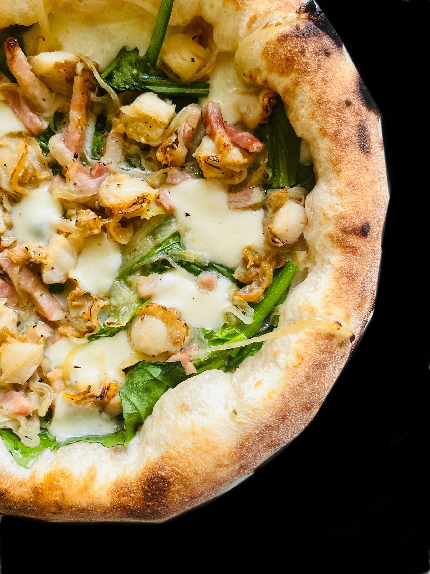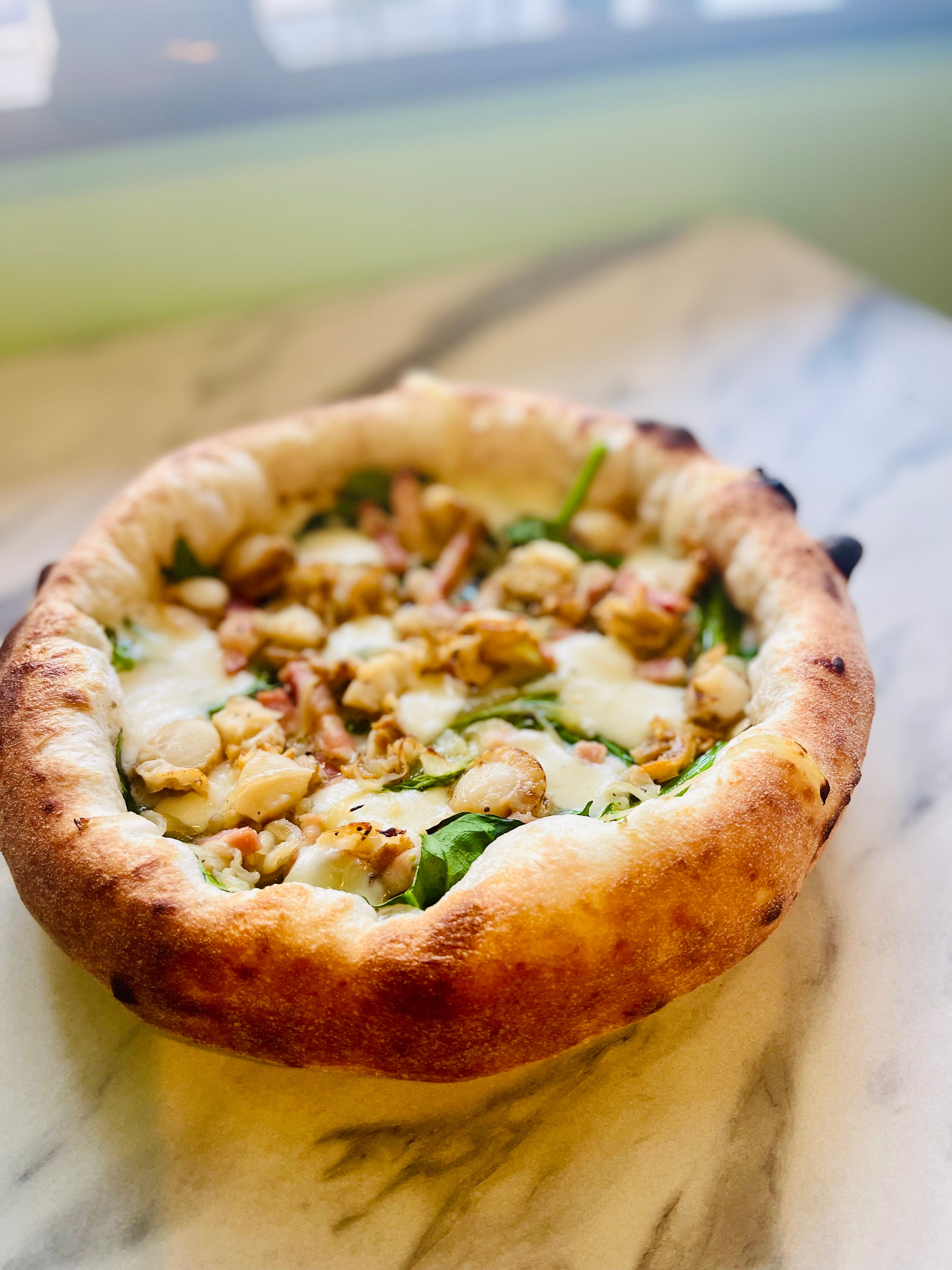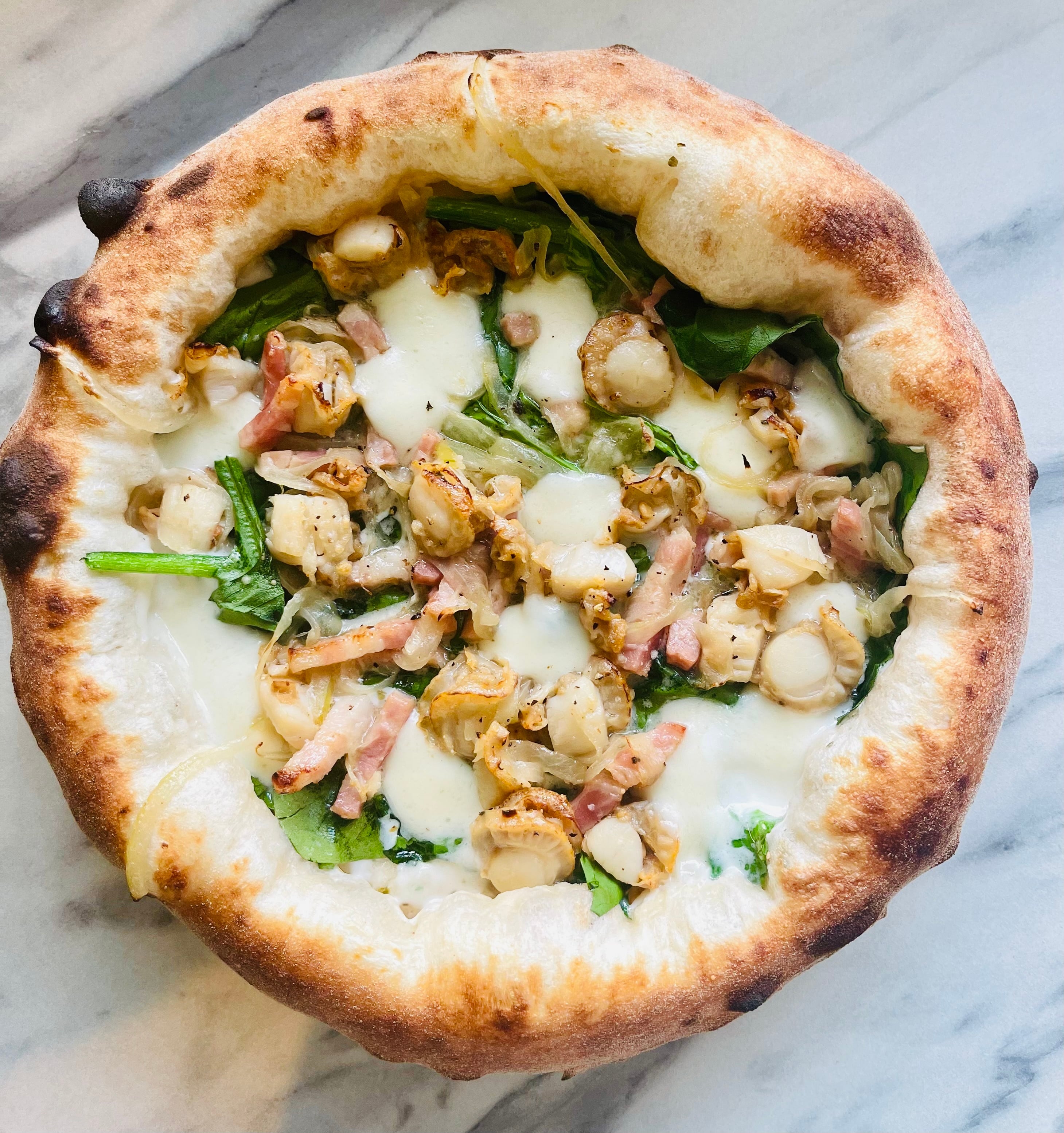 ホタテ、ベーコン、ほうれん草、クリームソース、モッツァレラ、オレガノ、ケッパー、ブラックペッパー